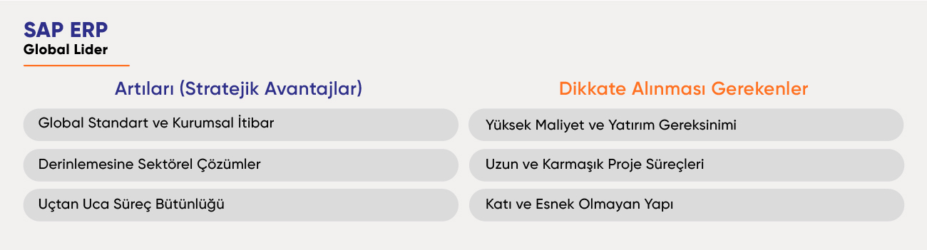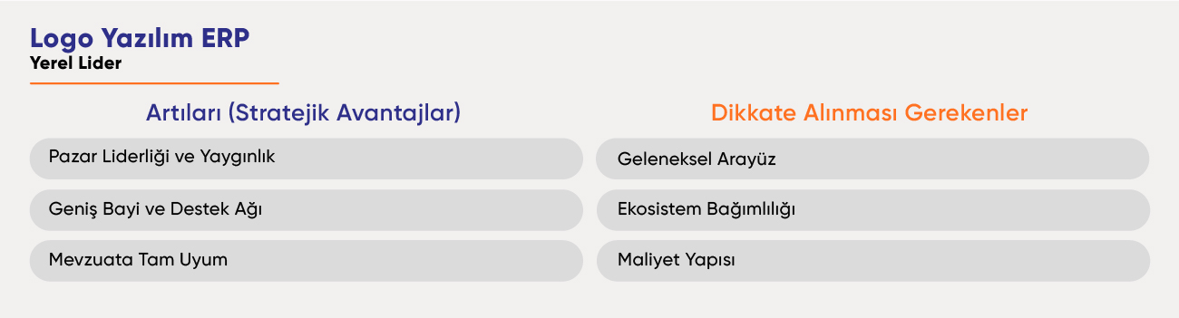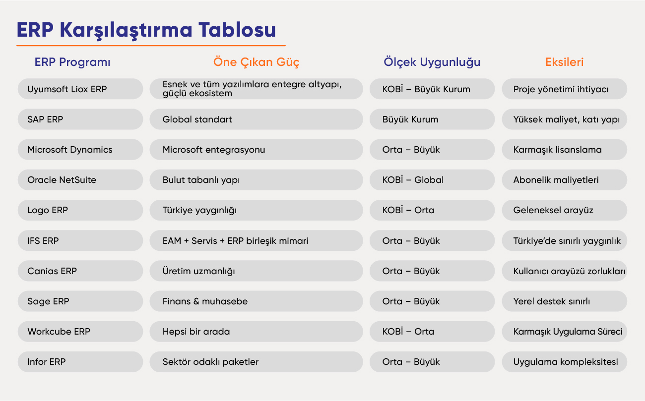 ERP seçim sürecinde işletmeler için en kritik konulardan biri, farklı çözümlerin güçlü ve zayıf yönlerini net bir şekilde görebilmektir. Bu nedenle hazırladığımız ERP karşılaştırma tablosu, Türkiye’de ve dünyada öne çıkan 10 ERP programını ölçek uygunluğu, öne çıkan özellikleri ve pazar konumları açısından yan yana inceleme imkanı sunuyor. Tablo sayesinde, ister KOBİ ister büyük ölçekli bir kurum olun, ihtiyaçlarınıza en uygun ERP yazılımını belirlerken daha bilinçli bir değerlendirme yapabilirsiniz.