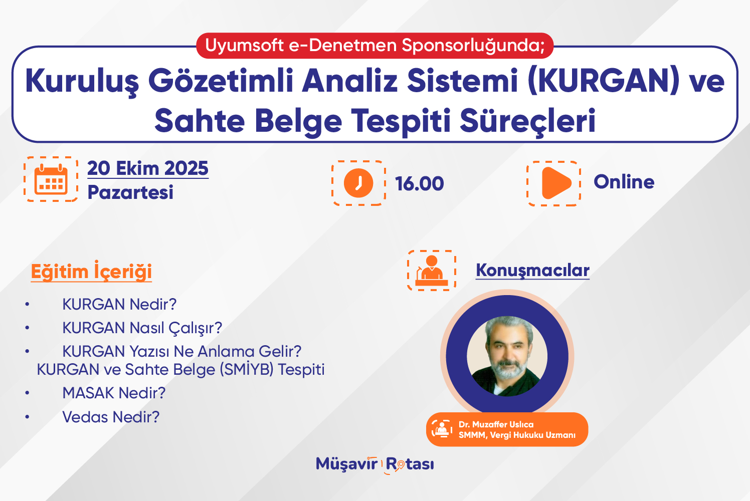 Kuruluş Gözetimli Analiz Sistemi (KURGAN) Nedir? Vergi denetiminde yapay zekâ destekli yeni dönem başladı! Bu eğitimde; KURGAN Nedir? KURGAN Nasıl Çalışır? KURGAN Yazısı Ne Anlama Gelir? KURGAN ve Sahte Belge (SMİYB) Tespiti, MASAK ve VEDAS sistemleriyle ilişkisi başlıkları çerçevesinde Kuruluş Gözetimli Analiz Sistemi’nin kapsamı, işleyişi ve mükellefler üzerindeki etkileri ele alınacaktır. 🕐 Süre: 1 Saat 💻 Format: Online Eğitim 💰 Katılım: Ücretsiz 🤝 Sponsor: Uyumsoft e-Denetmen