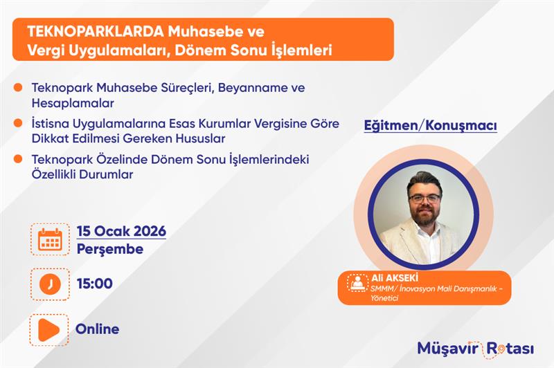 Teknopark Muhasebe Süreçleri, Beyanname ve Hesaplamalar ile İstisna Uygulamalarına Esas Kurumlar Vergisine Göre Dikkat Edilmesi Gereken Hususlar başlıklarının ele alınacağı eğitimde, ayrıca Teknopark özelinde dönem sonu işlemlerinde karşılaşılan özellikli durumlar da değerlendirilecektir. Eğitim, Serbest Muhasebeci Mali Müşavir ve İnovasyon Mali Danışmanlık Yönetici’si Ali Akseki tarafından gerçekleştirilecek olup 15 Ocak 2026 Perşembe günü saat 15:00’te yapılacaktır.